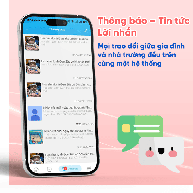 Tính năng Thông báo – Tin tức – Lời nhắn cho phép nhà trường gửi thông tin nhanh chóng, chính xác đến phụ huynh theo từng lớp hoặc toàn trường. Các nội dung như lịch học, hoạt động trong ngày, thông báo sự kiện, nhắc nhở đặc biệt hay lời nhắn cá nhân đều được truyền tải trực tiếp qua ứng dụng.