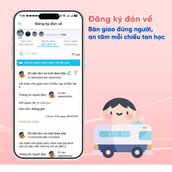 Đăng ký đón về là tính năng hỗ trợ nhà trường quản lý chính xác thông tin người đón trẻ mỗi ngày. Phụ huynh có thể chủ động đăng ký thời gian đón, người đón thay hoặc thay đổi thông tin trực tiếp trên ứng dụng.