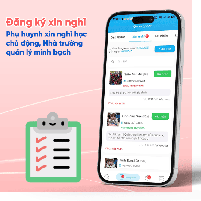 Thay vì nhắn tin hoặc gọi điện xin nghỉ như trước, phụ huynh có thể gửi đơn xin nghỉ trực tiếp trên KidsOnline với đầy đủ lý do, thời gian nghỉ và ghi chú cần thiết. Ngay khi đơn được gửi, giáo viên và nhà trường nhận thông báo tức thì.