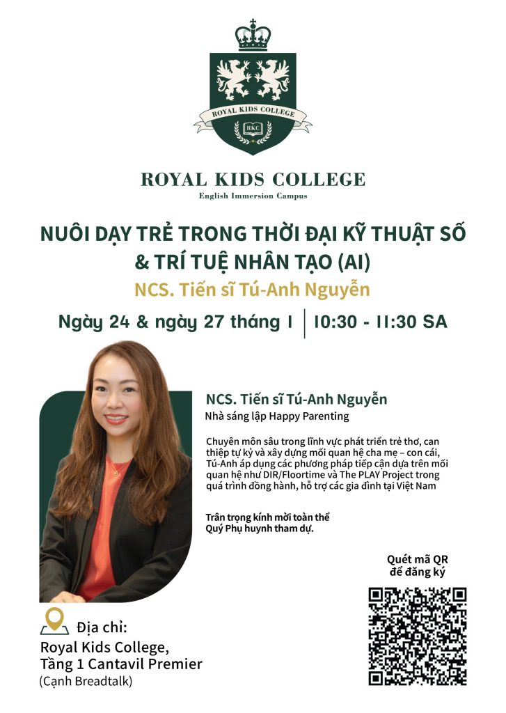 Chính từ nhu cầu này, Royal Kids College (RKC) đã tổ chức hội thảo chuyên đề “Nuôi dạy trẻ trong thời đại Kỹ thuật số & Trí tuệ Nhân tạo (AI)”, nhằm cung cấp góc nhìn khoa học, thực tiễn và dễ áp dụng cho gia đình có con nhỏ.